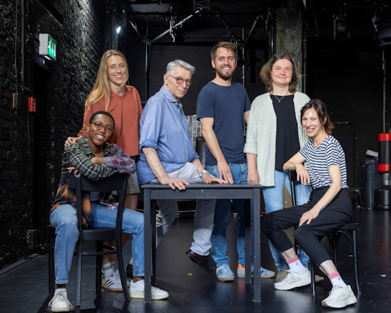Sie fiebern der Premiere von „und im Blau zu verschwinden“ entgegen: Autorin Evelyne de la Chenelière, Schauspieler und Tänzer Lutz Förster, Übersetzerin und Dramaturgin Gerda Poschmann-Reichenau, Regisseur Kornelius Eich sowie die Schauspielerinnen Stefanie Winner und Spieltrieb-Mitglied Amanda Kirchner. Gemeinsam mit Autorin Zsuzsa Bánk, die auch selbst auf der Bühne stehen wird, zeigt das kreative Kollektiv zur Duisburger Akzente-Zeit erstmals eine besondere Produktion im Theater Duisburg. Zwei Jahre lang hat das Ensemble in intensiven Probenphasen und künstlerischen Begegnungen frei gearbeitet.